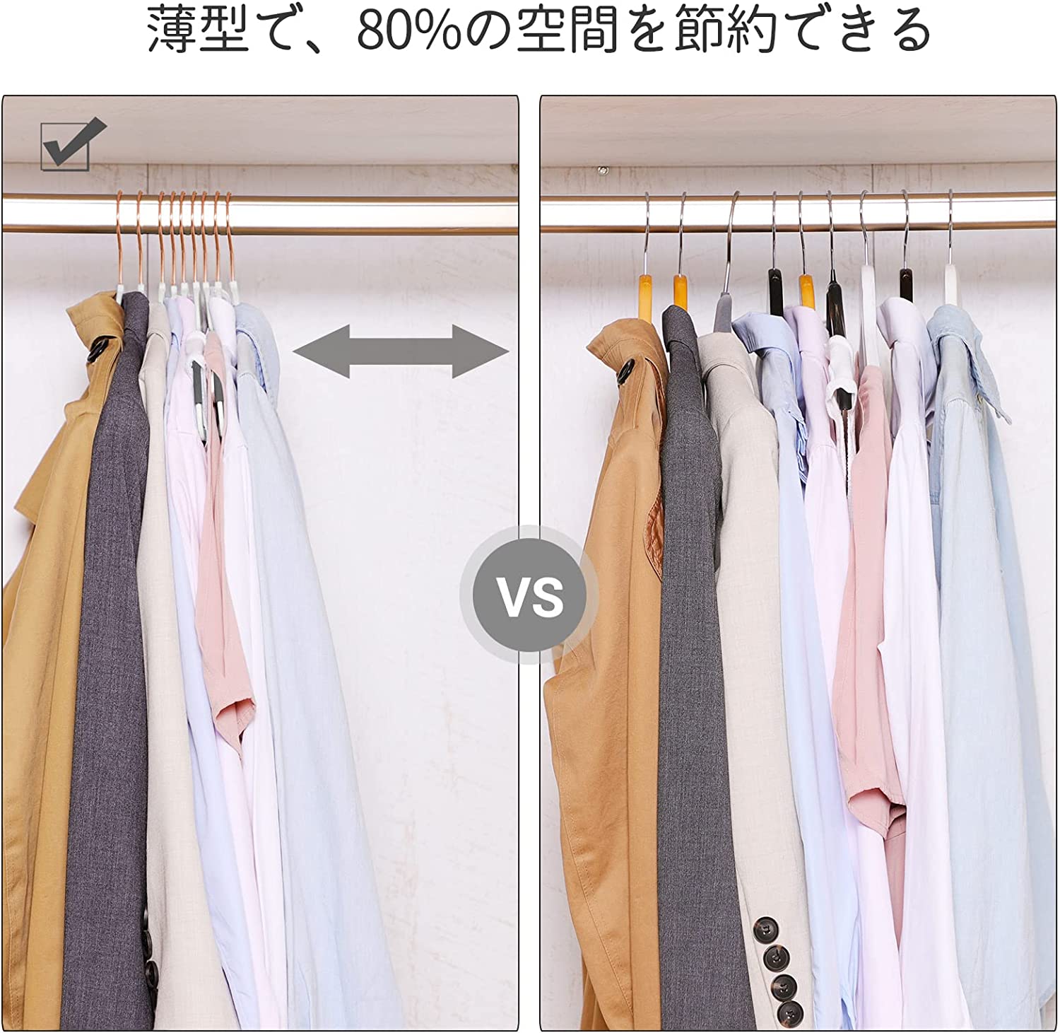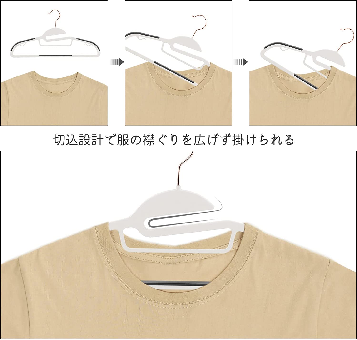 【型崩れ防止】首元の切込み設計で服の襟ぐりを広げずかけることができます。Tシャツはもちろん、ハイネックのセーターなども襟元を伸ばさずに、きちんと型をキープします