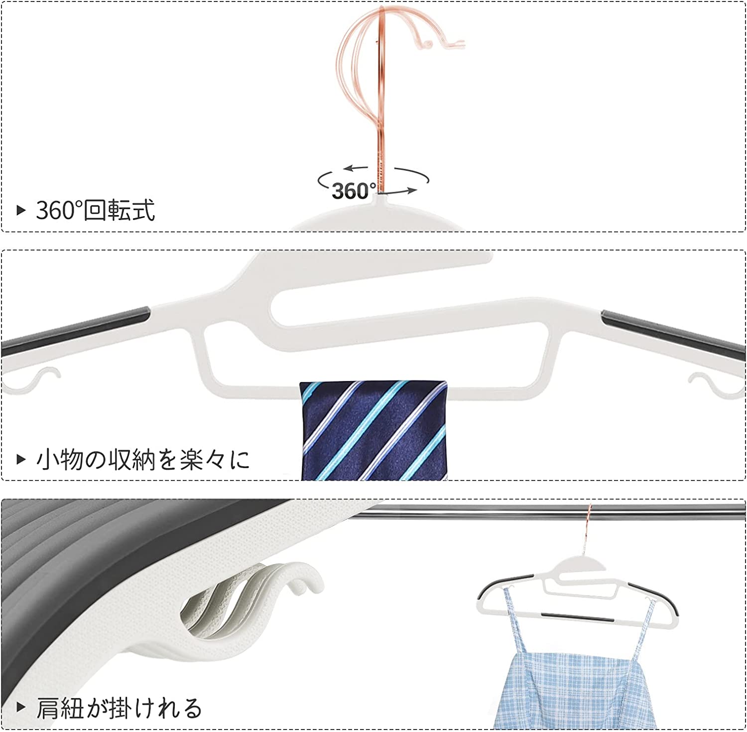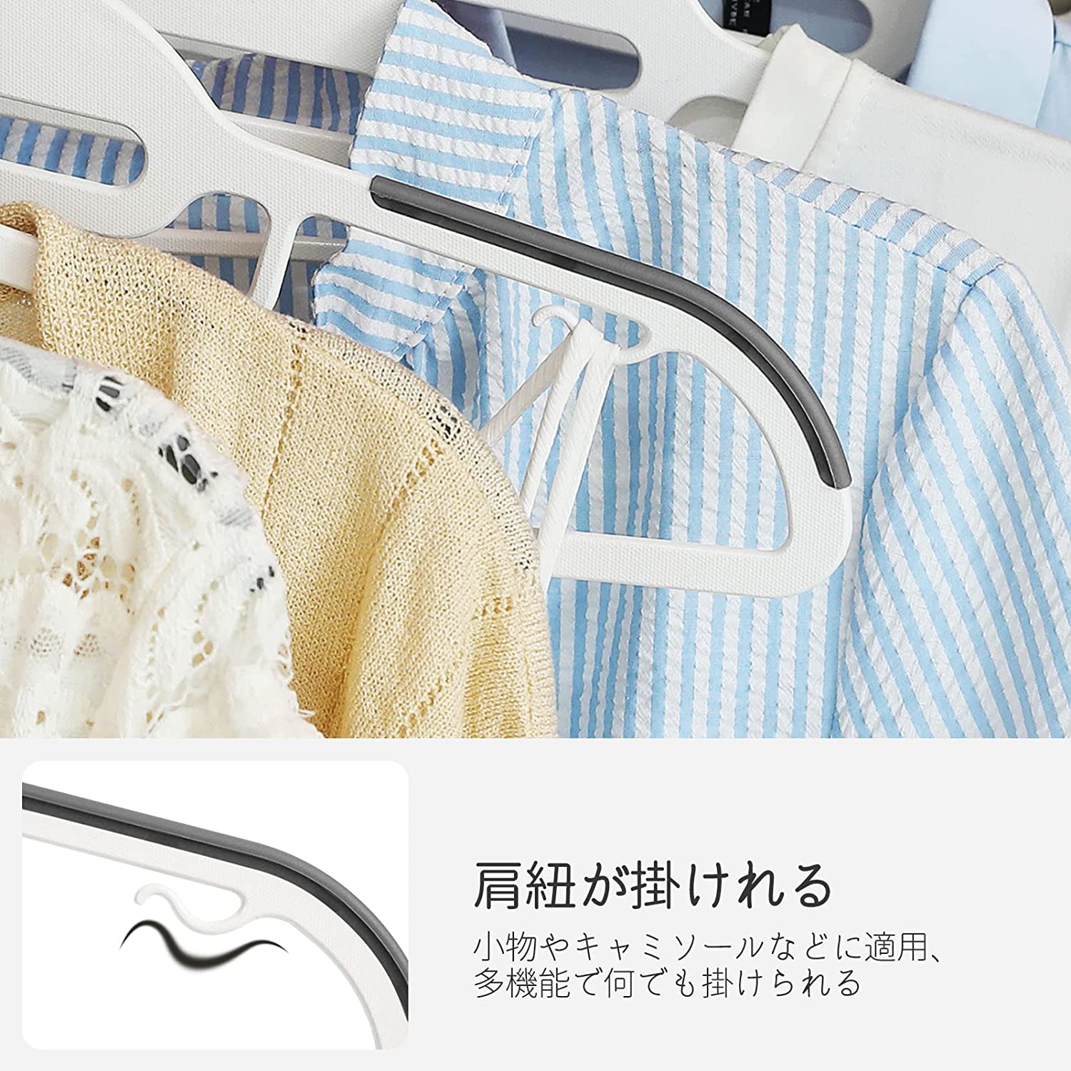 【多機能ハンガー】首元の切込みにはネクタイやスカーフがかけられ、ハンガーの内側のひも用フックで、キャミソール・ズボンなどもかけられます。またフックは360度回転可能、場に応じて角度調整できる実用性たっぷりです。外干しOKな両用可能のハンガーで、衣類ハンガーや洗濯ハンガーを統一して使う事ができます