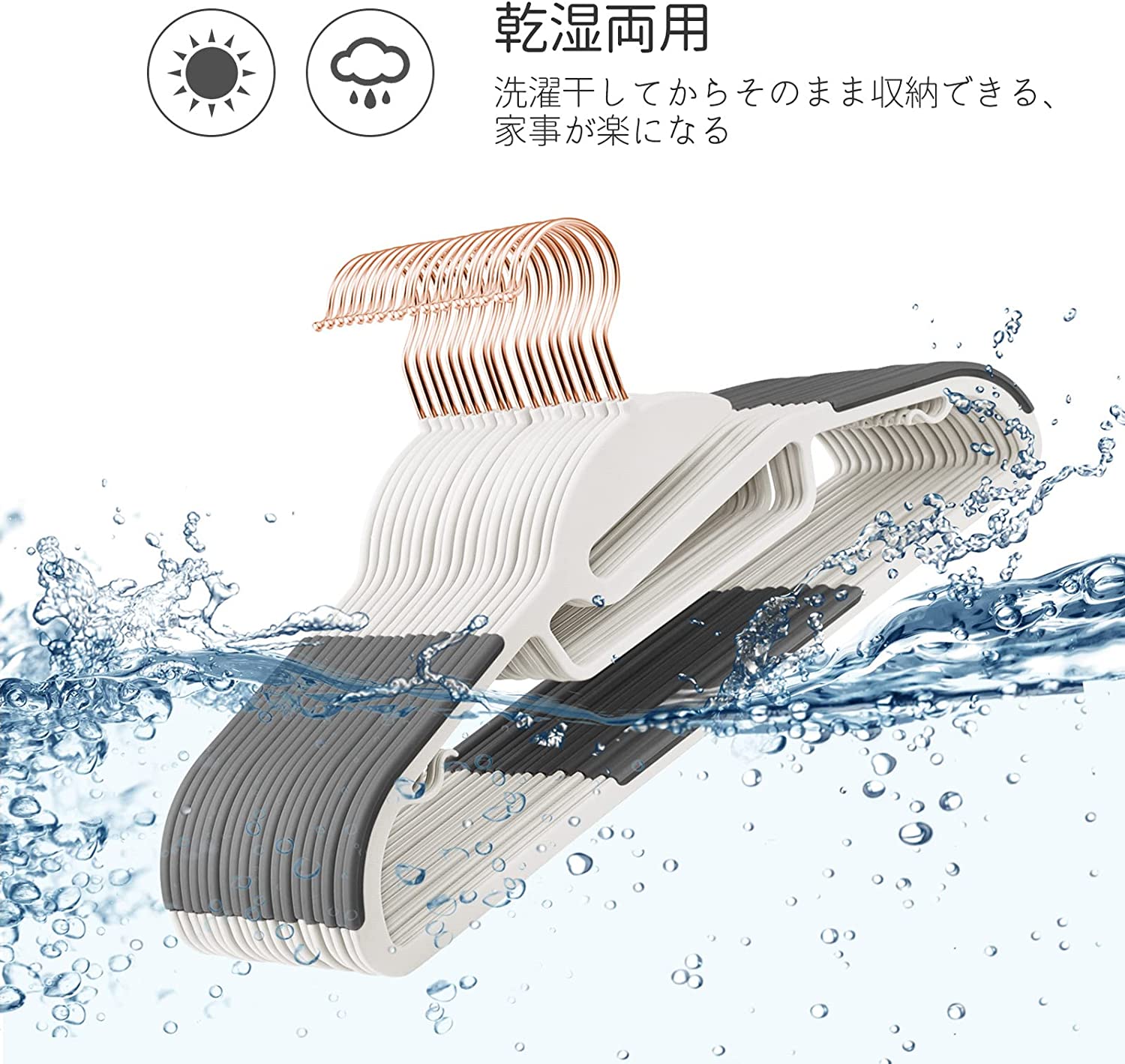 本体はABS・TPRで、フックはアイアン・クロムメッキで作られ、丈夫で耐久性が抜群なハンガーです。色移りをご心配なく洗濯ハンガーとして使用できます。首元の切込み設計で服の襟ぐりを広げずかけることができます。Tシャツはもちろん、ハイネックのセーターなども襟元を伸ばさずに、きちんと型をキープします。外干しOKな両用可能のハンガーで、衣類ハンガーや洗濯ハンガーを統一して使う事ができます。